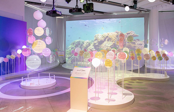 3Fに足を踏み入れると、色とりどりの球体バルーンがずらり。その光景は、まるでお花畑かキャンディボックスのようです。バルーン内のパネルには、未来に向けたアイデアや想いが綴られています。実はこれ、三菱電機グループの社員たちが考える明るい理想の未来を表現した「ミライへの声」なのだとか。職種も年代も異なるさまざまな社員たち350人が描く未来の中には、きっと共感できるものもあるはずです。気になる未来をぜひ探してみてください。