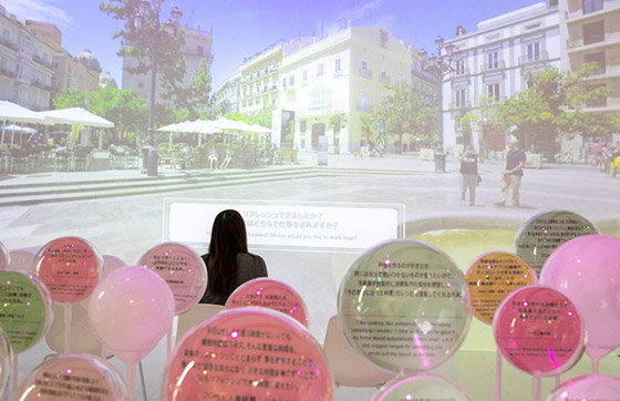 海外のお気に入りの街や森林の中で仕事ができたら……。そんな願いを叶えてくれるのが、「どこでもテレポーテーション」です。プロジェクターで映し出された質問に答えていくと、ワープ航行のような演出の後、あたり一面がバルセロナの街に。没入感もすばらしく、自分が座っている空間ごと瞬間移動した気分を味わえます。選んだ答えによっては、森林や海中に行くこともでき、まさしく「どこでもテレポーテーション」が可能。仕事後の休憩場所も気分に合わせて選べるので、さらなる秘境や絶景を満喫してみましょう。