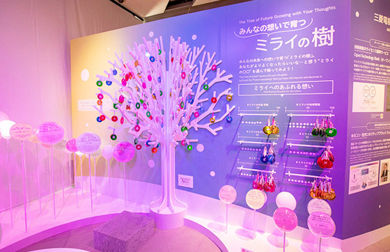 3Fの一角では、6つの色の実を付けた真っ白な樹木が幻想的な光に照らされています。これは、みんなの想いで育つ「ミライの樹」を表現したもの。自分が「よりよくなったらいいな」と願う“ミライの○○”のカードを選び、枝に掛けていくことで樹を育てていくコンテンツです。“○○”に入るのは、「交通・移動」「ものづくり」「働き方」など全6項目。カードの数は1週間ごとに集計され、取材日時点でのトップは「地球環境」でした。METoA Ginzaを訪れたら、ぜひみなさんの想いも託してみてください。