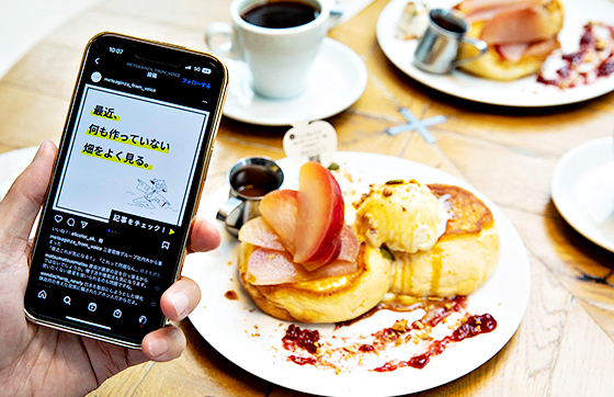 METoA Cafe & Kitchenの人気メニューであるパンケーキに、イベント限定バージョンが登場! 期間中は、この季節にぴったりの「アップルコンポートパンケーキ」を楽しめます。ほどよい甘さと酸味のバランスが絶妙なりんごのコンポートには、耕作放棄地を再生して作ったシードルを採用。「耕作放棄地って何?」と思った方は、ぜひパンケーキに添えられたピックをスマホにかざしてみてください。