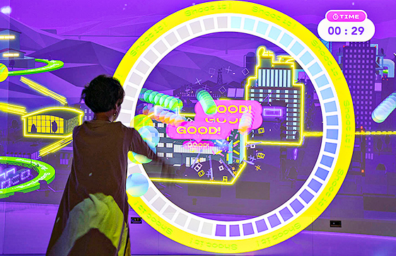 「そだてるタウン」の発展に合わせて、ウェルカムオブジェの内容も変化。海には洋上風力発電、屋根の上には太陽光発電パネルが新たに登場しています。クリーンエネルギーを効率的につくり、みんなで分けあう方法を探っていくのが今回のテーマです。2Fでは、巨大なビジョンでのさまざまなミッションを通じて、「エリアエネルギーマネジメントシステム」の可能性を学べます。