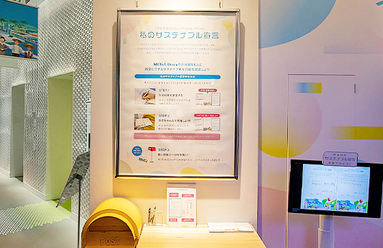 サステナブルな社会への第一歩は、自分で考え、行動すること。METoA Ginzaでは、そんな一人ひとりのアクションを応援するために、「私のサステナブル宣言」を開催中です。参加方法は簡単。2F出口に設置された専用はがきに、自分にできるサステナブルな行動宣言を記入し、会場のポストに投函するだけ。宣言をほかのみんなと共有することもできます。数ヶ月後には、METoA Ginzaからはがきで返信が届くので、行動の励みにもなります。みなさんもぜひ参加してみてください!