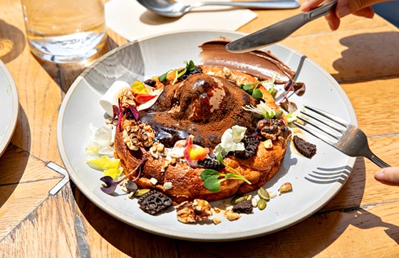 METoA Cafe & Kitchenでは、「あたりまえっ!?展」の開催に合わせたコラボスイーツが登場。METoA Ginzaのオープン(2016年)当時に大人気だったメニューをアレンジした、「Death By Chocolate(デスバイチョコレート)」です。フェアトレードチョコレートを使ったアイスとソースは、ふわふわのパンケーキと相性抜群。くるみやアーモンド、エディブルフラワーが彩りを添え、見た目も華やかなひと皿です。イベント開催期間中だけの限定メニューなので、ぜひお見逃しなく!