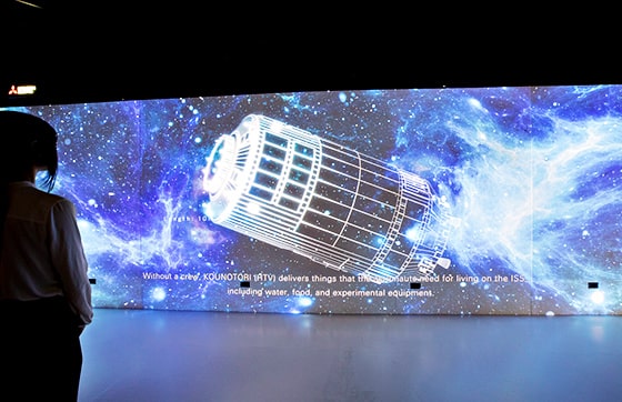 METoA 2Fの壁一面に広がる宇宙空間。「こうのとり」誕生の物語は、ここから始まります。壮大な映像とともに流れるのは、プロジェクトを成功に導いた開発者たちの声。約30年にわたる開発の背景には、幾多の困難やドラマがあったことが伝わってきます。そのたくさんの想いを乗せて、大切な物資をISSに届けるミッションが、いよいよスタート! 映像では、「こうのとり」が地球を飛び立ち、大気圏を抜けて、ロケットから分離するまでの様子がスリリングに描かれます。