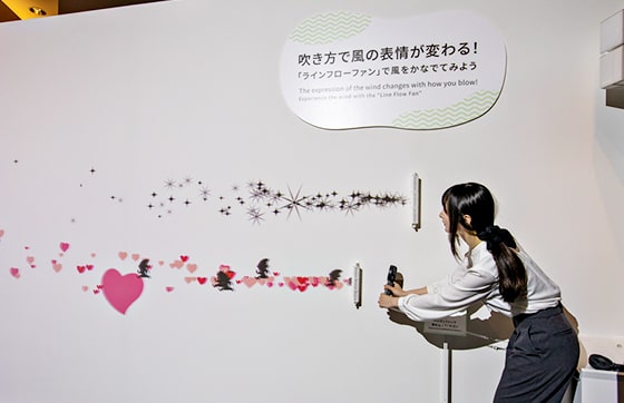 エアコンといえば、壁掛けがあたりまえ。その常識は、三菱電機が1968年に発売した「霧ヶ峰」から始まったのをご存知でしょうか。それまでのエアコンは床置きか窓掛けが主流。これを変えたのが、軽量・薄型で、まっすぐに進む風を特長とする「ラインフローファン」の搭載でした。METoA 2Fでは、このラインフローファンを使って“風をかなでる”ユニークな体験型アートを展示。あてる風の強弱によって、さまざまな文字やオブジェクトが流れ出します。お友だちやお子さんと一緒に、ぜひ遊んでみてください。