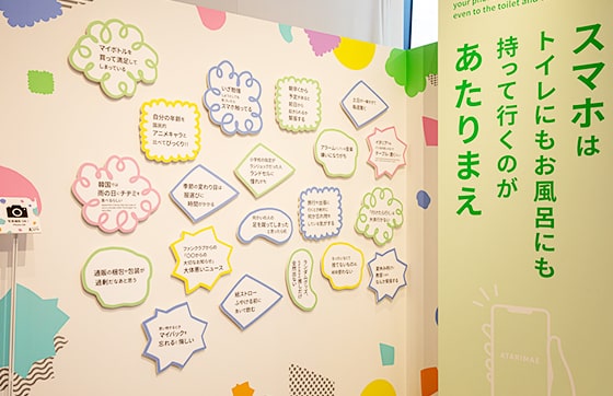 3Fエントランスでまず目に入るのが、壁やパーテーションをにぎやかに埋め尽くすメッセージボード。書かれているのは、日常にあふれる「あたりまえ」の数々です。読んでみると、「買い物するとき、マイバッグを忘れると悔しい」「アラームにしている音楽、嫌いになりがち」など、思わず共感したくなる“あるある”がいっぱい。なかには、「エスカレーターの三菱電機ロゴがカラーなのは、METoA Ginzaだけ」といった、“へえ”な発見も。気になる「あたりまえ」、みなさんはいくつ見つけられるでしょう?