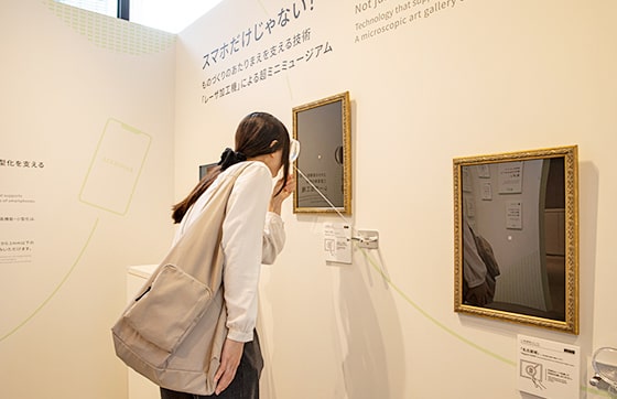 3Fの一角に突如現れたミュージアム。飾ってあるのは額縁だけ……? と思いきや、実はこれ、肉眼では見えないほどの超ミニアートなのです。ルーペで覗くと、極小サイズの銅板に「モナ・リザ」や「名古屋城」が精密に描かれているのがわかります。この精細な加工を実現しているのが、スマホの高機能・小型化を支える三菱電機のレーザ加工機。直径0.1mm以下の微細な穴を、毎秒7,000個という速さで加工できる高い技術力で、「スマホのあたりまえ」を進化させてきました。その精細で巧みな技を、ぜひ実際に鑑賞してみてください。