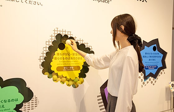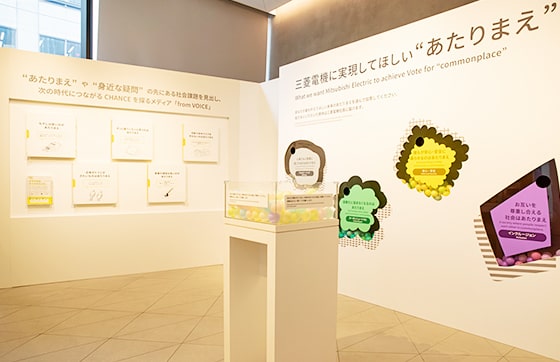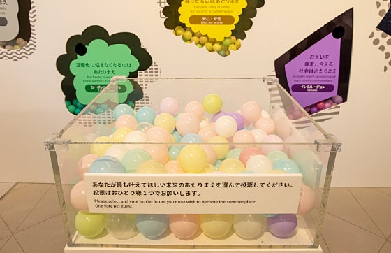3Fには、「未来のあたりまえ」づくりに向けた投票コーナーも設置されています。テーマは、「ウェルビーイング」「カーボンニュートラル」「安心・安全」「インクルージョン」「サーキュラーエコノミー」の5つ。この中から、三菱電機に実現してほしい「あたりまえ」を選び、対応するテーマカラーのボールを入れて投票します。みなさんの想いを、ぜひ三菱電機に届けてください。