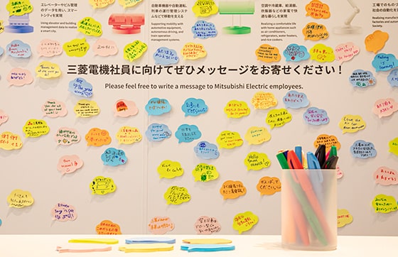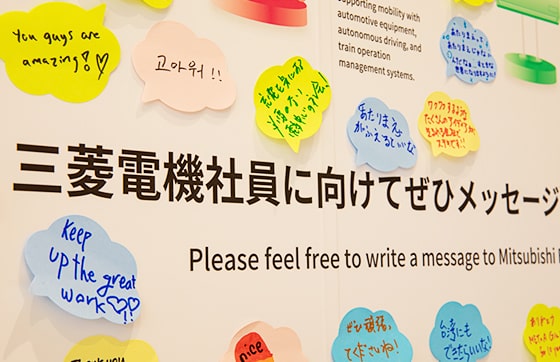 3Fでは、三菱電機の最先端技術を体感できる多彩なコンテンツが勢ぞろい。壁いっぱいに貼られたみなさんのお声や、三菱電機グループ社員からのメッセージにもご注目ください。