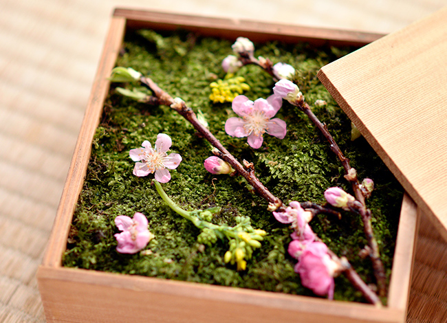桐箱に苔を敷き、桃花と菜の花をしつらい春景色に。