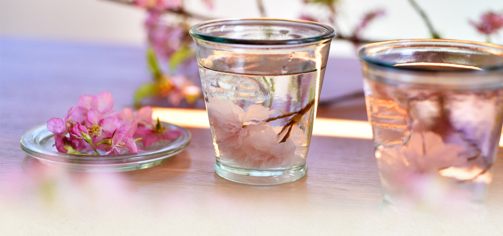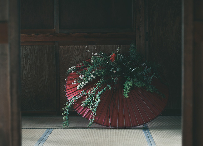 光に透ける鮮やかな紅色を浴びて色の力が降り注ぐ中、傘をゆっくりと開く。小手鞠、桜、椿など時節の草花が持つ華やぎを手にうけとめながら番傘の頂にしつらう。