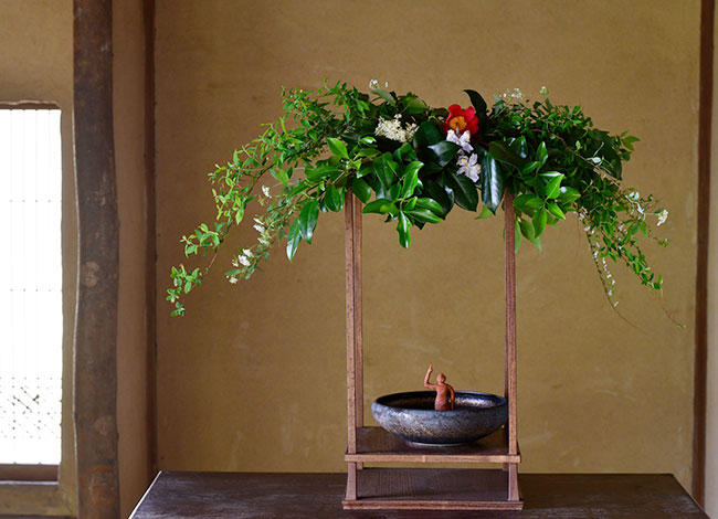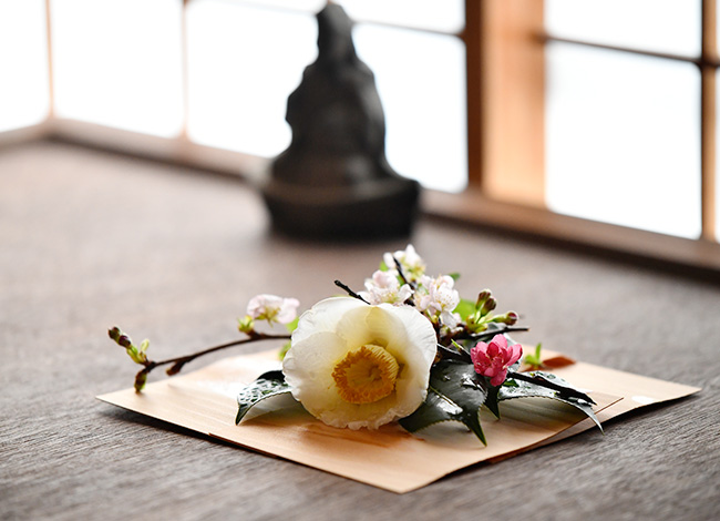 薄くとも宿る木の力をありがたくいただきながら、杉懐敷に白椿、桃、桜の花などを盛り、花供物に。