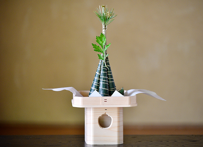 今回は粽を山型に合わせたところに日本の代表的な薬草である蓬を添え、依代の軸に松を立ててみた。
