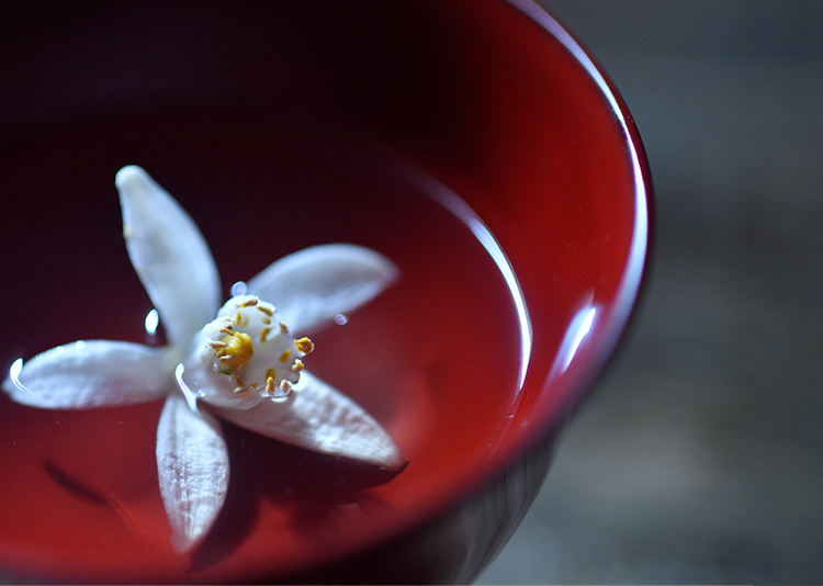 御供物を下ろすとき、ひと花、ふた花、水に入れてつくるスイカズラ水はほんのりと甘く美味。