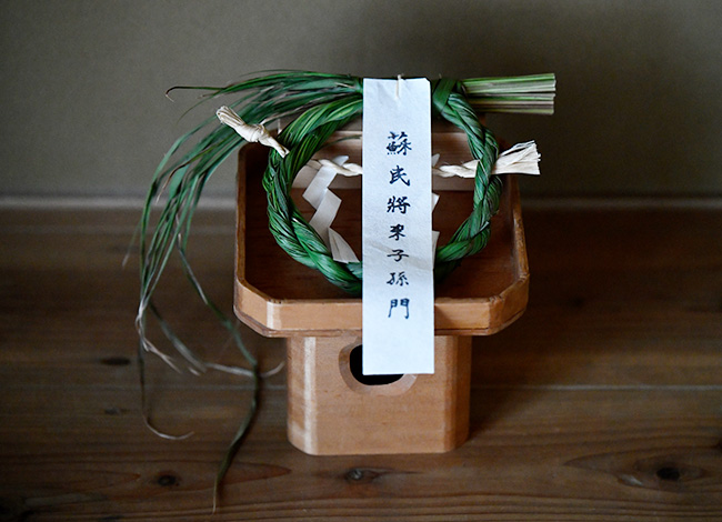 青々としたチガヤで左縄のしめ縄を拵えたところに蘇民将来の子孫であることを記す札。