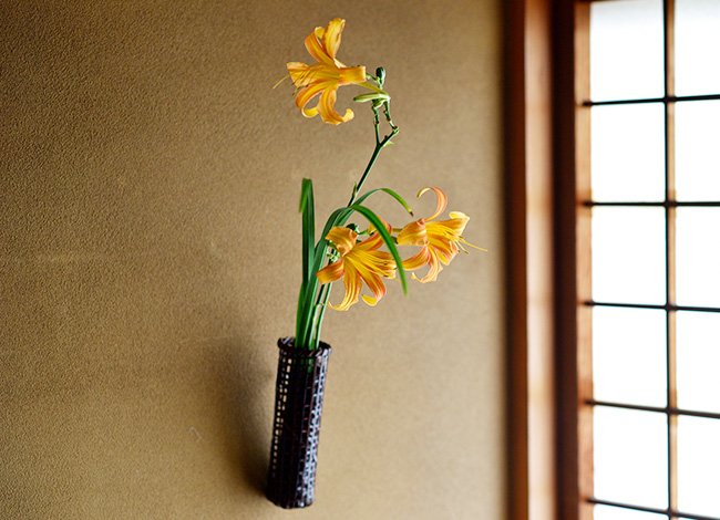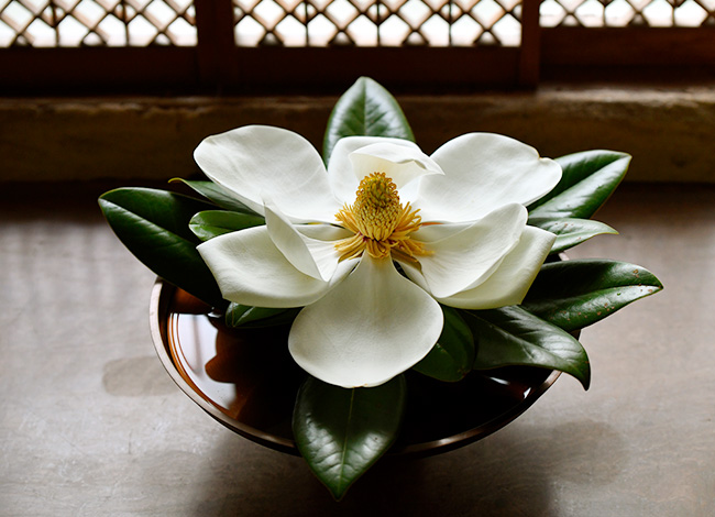 時期がくると甘い香りは高みから放たれて梅雨時の空気に溶け込む。木から一輪降りてもらい、花器に入れれば、地上に強い力と香りを放つ。