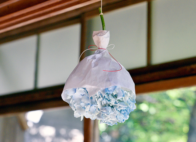 紫陽花の花枝を奉書で包み、紅白の水引で結ぶ。包みの中には願い事を忍ばせる。