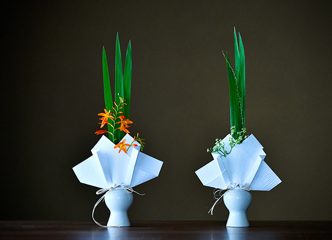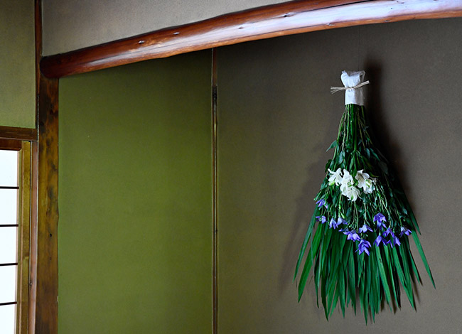 今回は姫桧扇水仙の葉、桔梗、白花の百合水仙などを束ね檀紙と精麻で包み、七夕の御供花に。