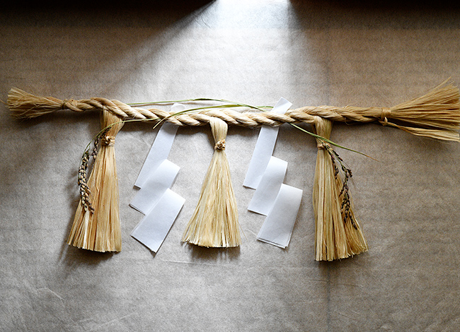 本麻とも呼ばれる照りのある精麻で、しめ縄を拵えて紙垂をさげる。