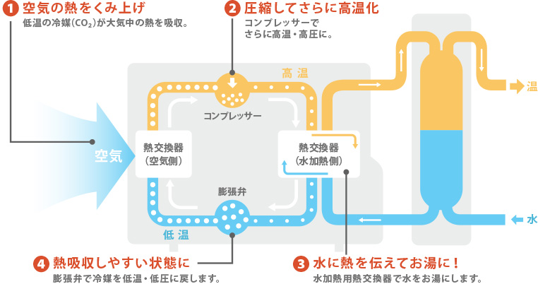 ヒートポンプはその名の通り、熱(ヒート)を汲み上げる(ポンプ)装置です。具体的には、自然の空気中にある熱を取り入れて圧縮することで高温にして、その熱で給湯器なら水、エアコンなら部屋をあたためる仕組みです。