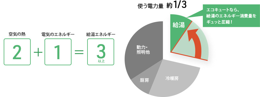 ヒートポンプが優れているのは、給湯器で例えると「1」の電気エネルギーを使って「2」の空気の熱を汲み上げ、合計で「3」の給湯エネルギーを得ることができる点にあります。これはつまり、電気エネルギーだけでお湯を沸かすのに比べ、消費電力量は約1/3になるということなのです。