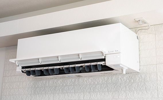 まずは、リビングから。こちらは、みなさんお馴染みのエアコンですね。ここ神奈川県は温暖地域ですが、もっと寒い地域でも暖房できる「ズバ暖霧ヶ峰」という機種もあるんですよ。外気温が-15℃でも最高約60℃(ハイパワー運転時)の温風を出すことが可能です。