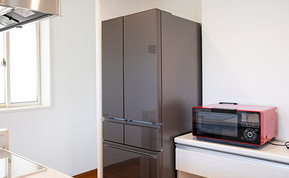 続いて、キッチンに来ました。冷蔵庫ですね。これにもヒートポンプが?
