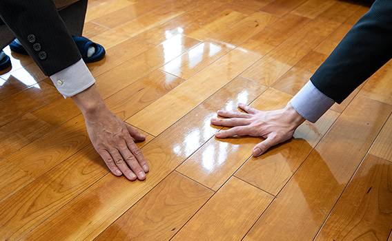 皆さん、次は足元に注目してください。先程二刀流という言葉が出ましたが、皆さんが立っているフローリングには、三菱ヒートポンプ式冷温水システム「エコヌクール」が設置されています。風を使わないので、暖房では陽だまりにいるように身体の中から暖まることができ、冷房では自然な清涼感を得ることができるんですよ。