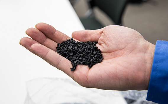 ハンドルとパイプ部分です。どちらも、ボーイング787の主翼を作る際に発生した端材から再生した炭素繊維と樹脂を混ぜて成形しています。ちなみに、こちらが「ペレット」と呼ばれる状態の炭素繊維です。これを高温で溶かし金型に流し込んで部品を成形します。でき上がったハンドルとパイプが信菱電機に届き、掃除機として組み立てられていくのです。