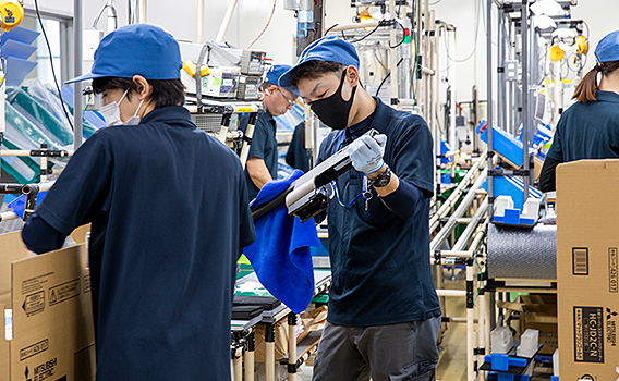 訪れたのは三菱電機のクリーナーの組立を行っている信菱電機(株)。スティック型掃除機「iNSTICK ZUBAQ」の開発担当者、三菱電機ホーム機器株式会社の内田龍一氏の案内で組立ラインを見学しました。
