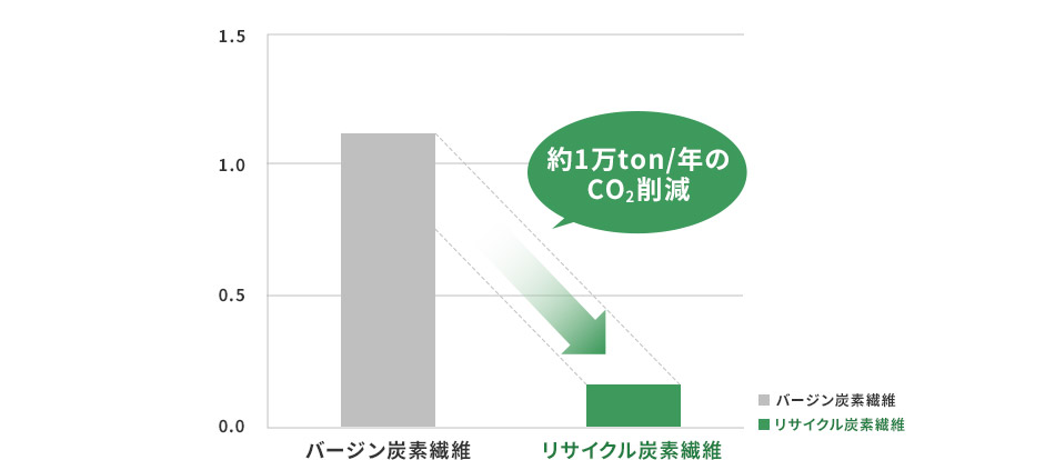 バージン炭素繊維を製造する場合と比較し、約1/10となる年間9900tonのCO2削減量が見込める。