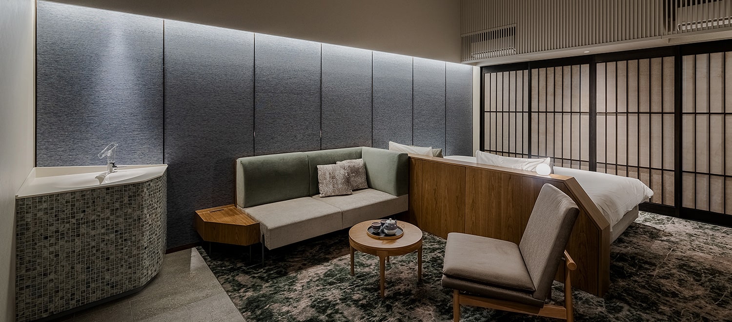 館内空間やランドスケープデザインでは、西条市で見られる「うちぬき」(地下水の自噴井)や、愛媛県を産地とする「伊予青石」の美しい色合いなどがモチーフになっています。客室は、多様な旅のかたちに合った滞在が楽しめるHOTELタイプと、旅館を現代的に解釈した上質なプライベート空間で全室露天風呂付きのVILLAタイプ、趣の異なる2つのスタイルが用意されています。