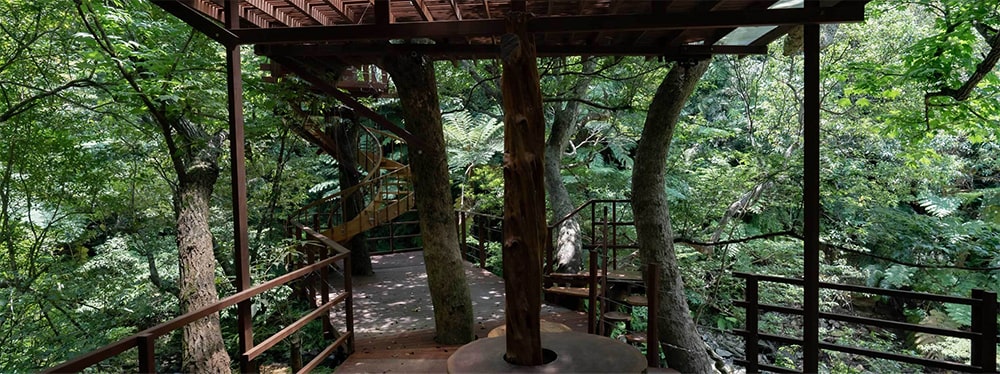 沖縄を代表する清流の一つ、源河川のほとりに立つツリーハウスの周りには360度の亜熱帯の森が広がり、室内ではハウスを支えている木の幹に触れることもできます。自然と一体となった空間づくりはゲストルームだけでなく共用部分にも及び、自然と人の境目があえて曖昧にデザインされています。