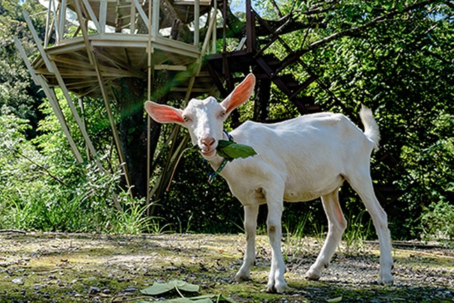 「Treeful Treehouse Sustainable Resort」は、その名が示す通りサステナビリティをコンセプトにしています。化石燃料をなるべく使用せず、電気も使用量より多くの電力を太陽光で発電することにより、持続可能な社会への貢献を目指しています。化石燃料で動かす草刈り機も使わず、“チームメンバー”のヤギがオーガニックに雑草をきれいにしています。