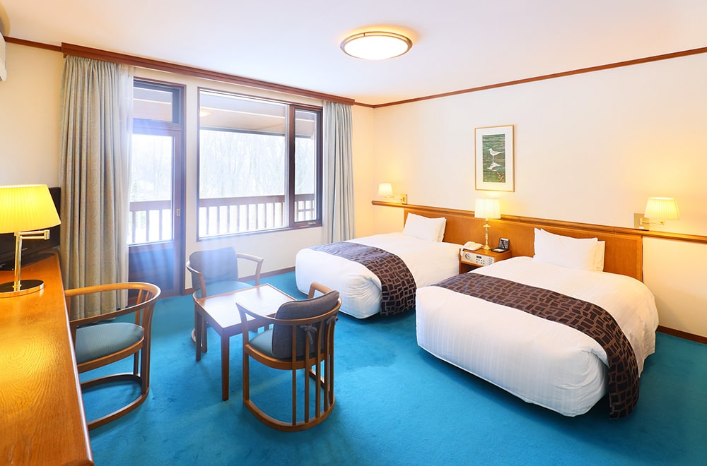 全55室の客室はベッドを配した洋室タイプで、木のぬくもりに満ち、落ち着いたインテリア。本館から枝分かれするように配置されたいずれの客室も大きな窓一面にブナの原生林や八甲田連峰を臨み、窓の外に広がる神秘的で雄大な景色を眺めながら、心安らぐくつろぎの時間を過ごすことができます。また、館内は温泉熱を使用した床暖房システムを導入し、エネルギー効率の向上とCO2排出の削減に取り組んでいます。