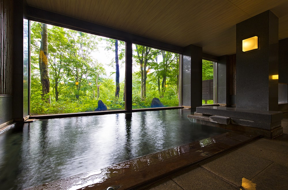 温泉大浴場からは青森ヒバの香り漂う浴槽越しに手つかずの森を望むことができ、自然と一体になったような開放感があります。サウナや水風呂も備えられており、湯上がりには八甲田の天然水で体の芯から大自然を味わうことも。さらにホテルゲストは、送迎サービスを利用して歴史ある姉妹館「酸ヶ湯温泉」の名湯を楽しむこともできます。