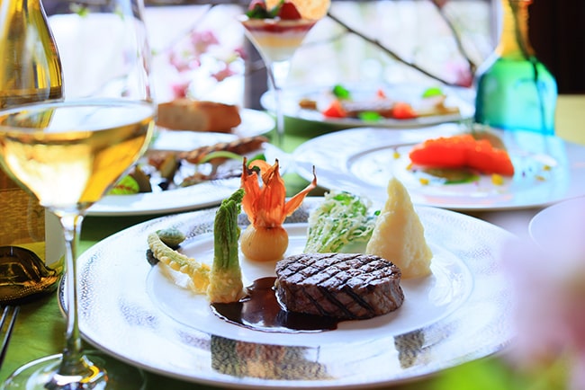 食事は地元青森の恵みをふんだんに活かし、提供する食材の50%以上は地域産。「フレンチフルコース」と「和食会席」から選べます。館内のフレンチレストランでは、青森県産牛肉や、糖度が高く生でも味わえる嶽きみ(ブランドとうもろこし)、陸奥湾産ホタテなど地元の恵みを活かした料理を提供。料理の味を一層引き立てるために「八甲田伏流水」を使用しており、奇をてらった料理ではなく、素材本来の味を楽しめます。
