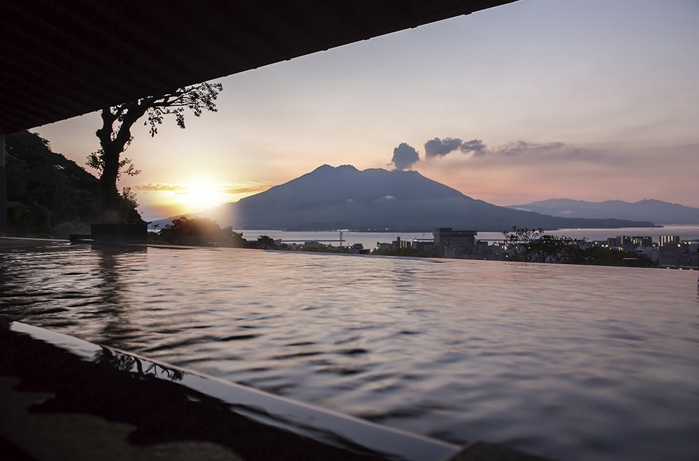 滞在のクライマックスは、標高108メートルの高台に位置する展望露天温泉「さつま乃湯」へ。地下1,000メートルから湧き出る天然の炭酸水素塩泉は、“美人の湯”として古くから愛されてきました。湯につかれば、眼下には錦江湾と市街の景、そして正面には桜島が。特別な眺望と癒やしがゆったりと時を溶かしてくれることでしょう。