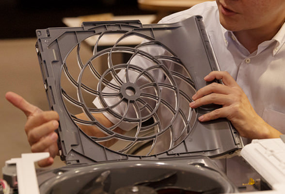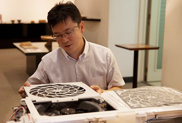 「パーソナルツインフロー」です。ここには2つのプロペラファンが搭載されています。センサーで検知した「暑がりさん」「寒がりさん」それぞれに向けて、最適な温度・風量の風を吹き分けることができます。こうした体感温度に着目した空調システムにより、高い省エネ性能を実現。一般財団法人省エネルギーセンター主催の「省エネ大賞」を受賞しているんです。