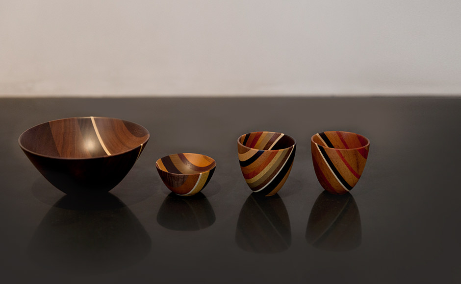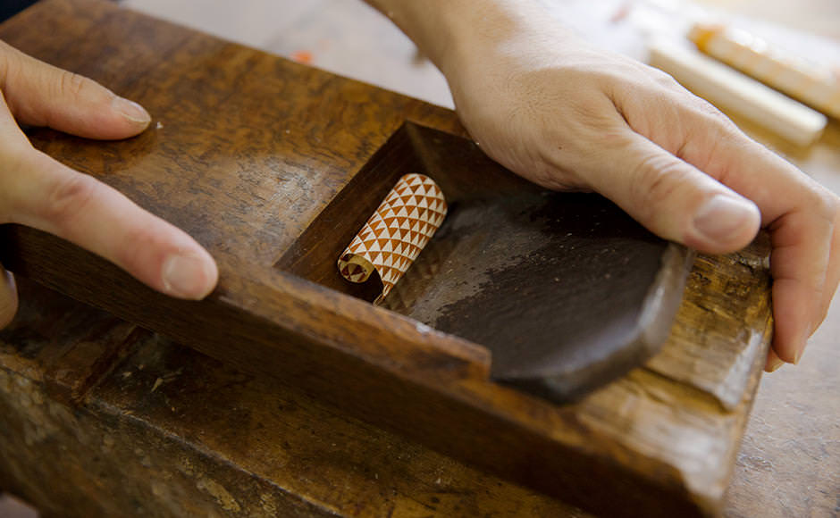 「なかなかお上手ですね(笑)。このズクを貼り合わせた板を組み立てて箱状の小物入れにしたり、あるいは既製品に貼り合わせたりして、さまざまな商品を製造していきます。ズクの他には、ロクロなどを使い、ムクの状態から直接立体的な製品を加工する『ムク物』という技法もあり、寄木細工には、様々な表現方法があります。」