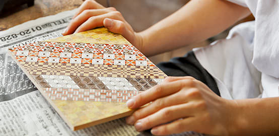 「この工程で少しでも角度が合わなければ、綺麗な模様は作れません。1つひとつ、神経を集中させながら、パーツの角と角がぴったりと重なるよう、さらなる加工を施していきます」