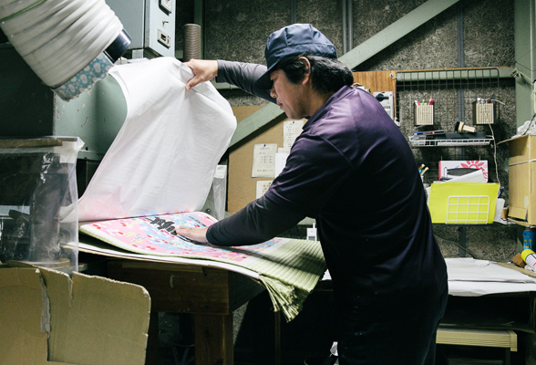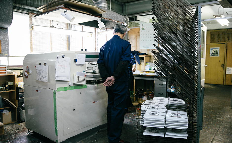 最初に拝見したのは、印刷場。ここではスクリーン印刷技術を用い、専用紙に1色ずつインクを重ねながら、蔵元から預かった印(絵柄・銘柄)のデザインされた“転写紙づくり”が行われていました。
