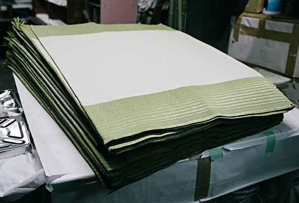 その後の工程を受けるプレス場では、菰への高温高圧プレスが行われます。菰の印刷面には特別な白い塗料が塗布され、プレス機械でその印刷面に転写紙に刻まれた印を転写。作業を担当するプレスの職人曰く「インクが菰にきれいに乗るよう、その日の天気・湿度などをみながら回数・圧力を調整している」のだそうです。