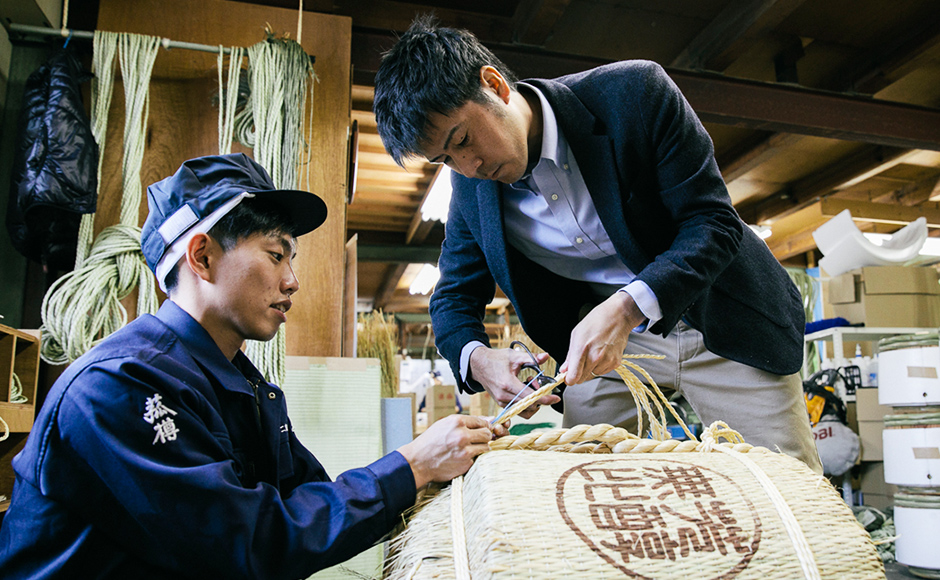 なお、最も大きな四斗樽(直径60センチ・高さ60センチ、最大容量72リットル)を包む菰には“山田錦”など背の高いわらが使われます。わらの調達は「兵庫県の農家さんにお願いして、ご厚意で田んぼの稲刈り稲木掛けをさせていただいてます」。近年は時代要請に応えるため、樹脂製の菰が主流となっています。