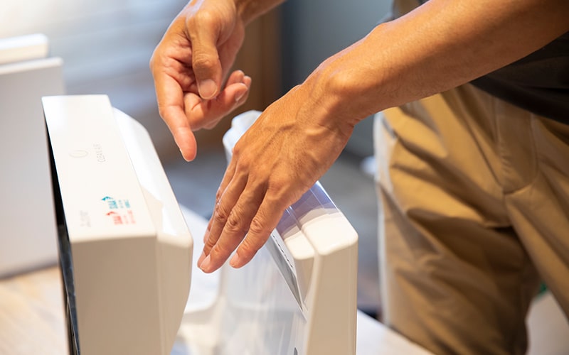 ハンドドライヤーは欧米で古い歴史があるものですが、三菱電機のジェットタオルは、手のひらと甲の両側から同時に高速気流が噴き出す世界で初めての製品として1993年に誕生しました。当時、中津川製作所で開発していた高出力のブラシレスモーターを活かして、何か新しい商品を生み出せないか検討が進められていたんです。初号機を発売してからは、省エネ性の向上やコンパクト化、乾燥時間の短縮、騒音の低減などの進化を続けてきました。