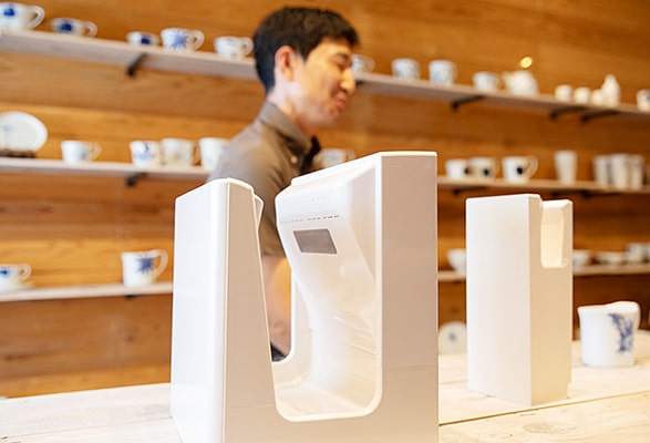 我々も量産段階では金型を製作するので、素材こそ違いますが磁器と同じですね。プラスチックの部品であれば樹脂を型の中に流し込んで作っていきます。石膏の型をつかって泥しょうの水分を吸収して成形する製造方法にはおどろきました。