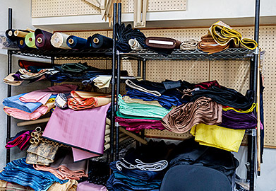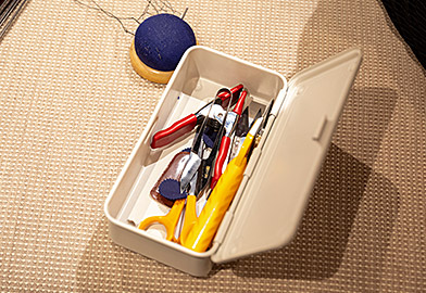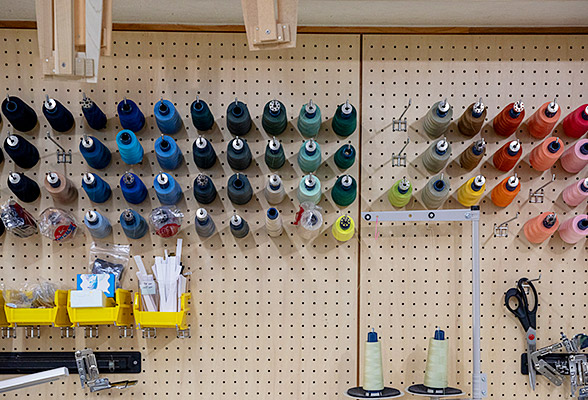 工房に足を踏み入れると、整然と並んだ道具、生地の反物や骨組みなど、傘を構成するあらゆる素材が静かに出番を待っていました。ここで洋傘がどのようにつくられるのか、洋傘加工職人の小出水さんに案内していただきました。