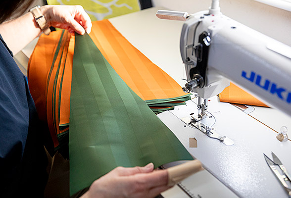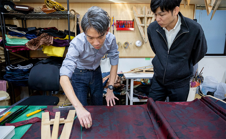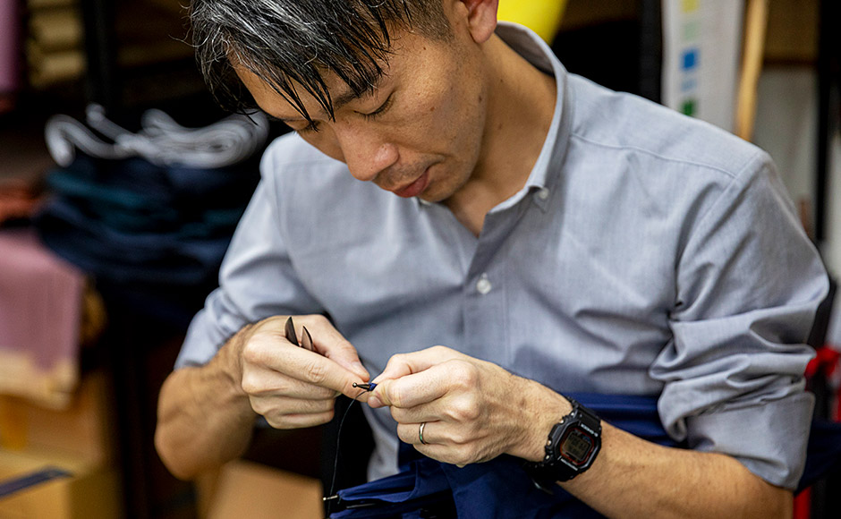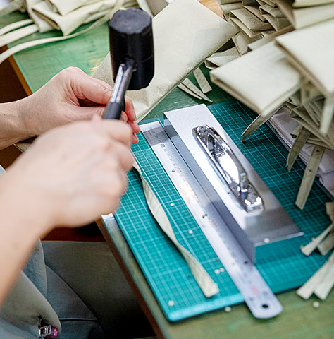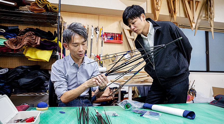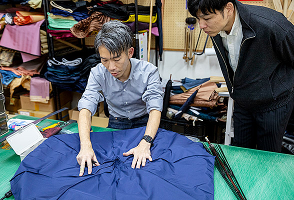 を守り続けてきた老舗です。生地の裁断から縫製、骨組みと布を繋ぐ仕立て、手元の取り付けに至るまで、すべての工程を自社内で完結。