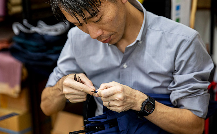 そしていよいよ、骨組みに傘布を縫い付ける「穴かがり」という作業へ。最初に傘布の頂点を傘骨の先端に挿して、中棒の太さに合わせて締めつけた後に、それぞれの骨の先端部分に“先玉”と呼ばれる部品を取り付けて1箇所ずつ縫い付けていきます。要する時間は骨が16本の傘で1本あたり約15分。1時間に4本で1日30本くらいを仕上げることもあるそうです。