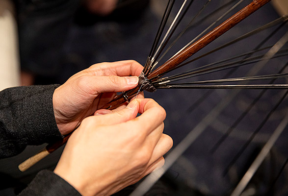傘の持ち手となる手元は楓(かえで)、寒竹(かんちく)、籐(とう)、もみじ、チェストナッツ、マラッカ、ヒッコリーなどから選ぶことができます。素材ごとに経年変化が異なり、使い込むほどに色艶が増していくそうです。こうして、一本の傘がようやく“道具”として命を宿します。